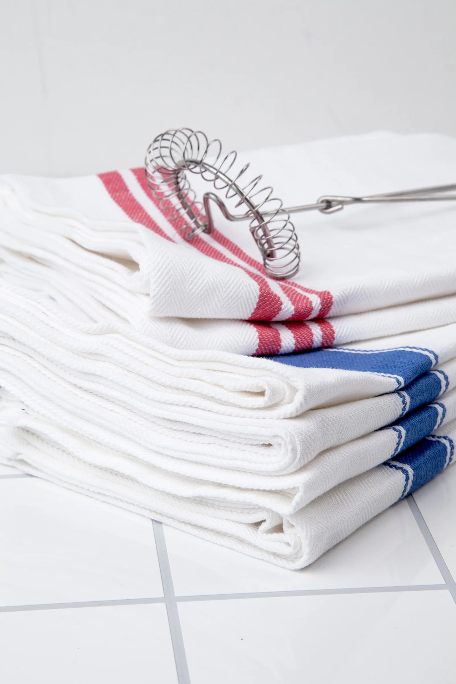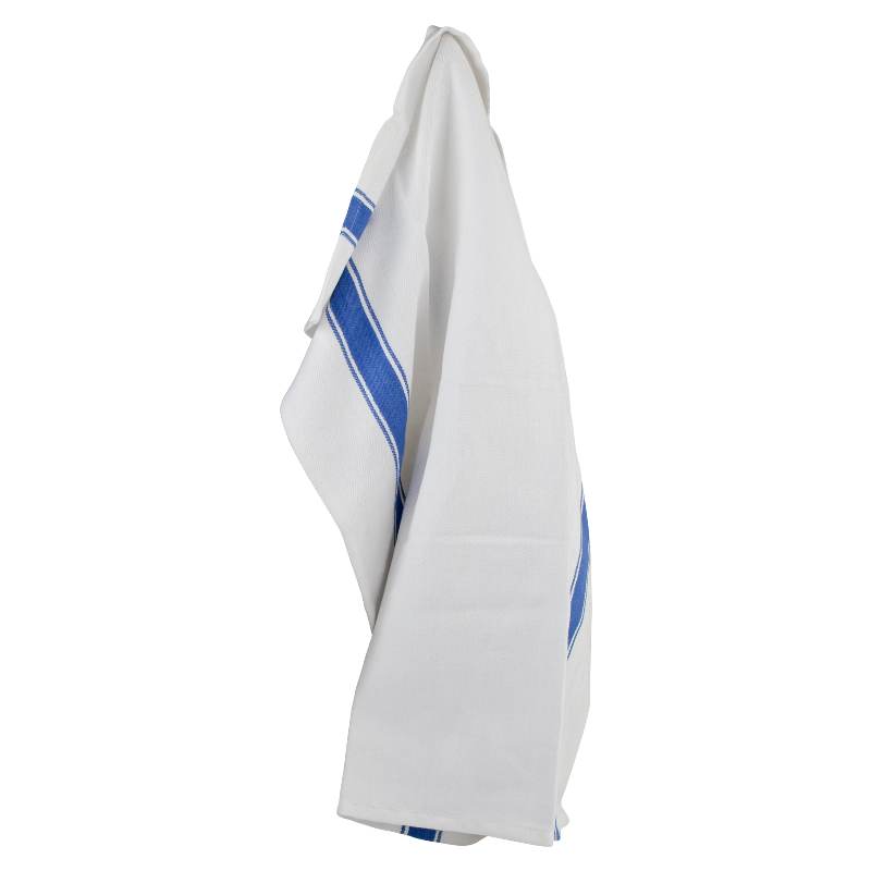 Vit kökshandduk med blå ränder, perfekt för både professionella kök och hemmabruk. Tillverkad i en slitstark blandning av bomull och lin, fri från gifter och kemikalier och certifierad enligt STANDARD 100 by OEKO-TEX®. Praktisk, hållbar och idealisk för daglig användning.