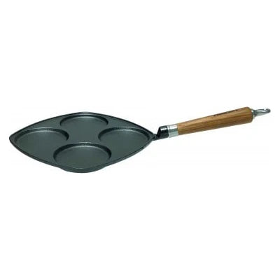 Traditionell gjutjärnspanna med fyra runda formar, perfekt för blinier eller ägg. Förinstekt med svensk KRAV-märkt rapsolja. Oljat ekträskaft för bekvämt grepp.