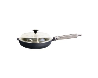 Traktörstekpanna med rund kant, utrustad med rostfritt värmeventilerat skaft för säkert och bekvämt grepp. Förinstekt med svensk KRAV-märkt rapsolja. Levereras med glaslock med bakelitknopp som tål ugnsvärme upp till 220ºC.