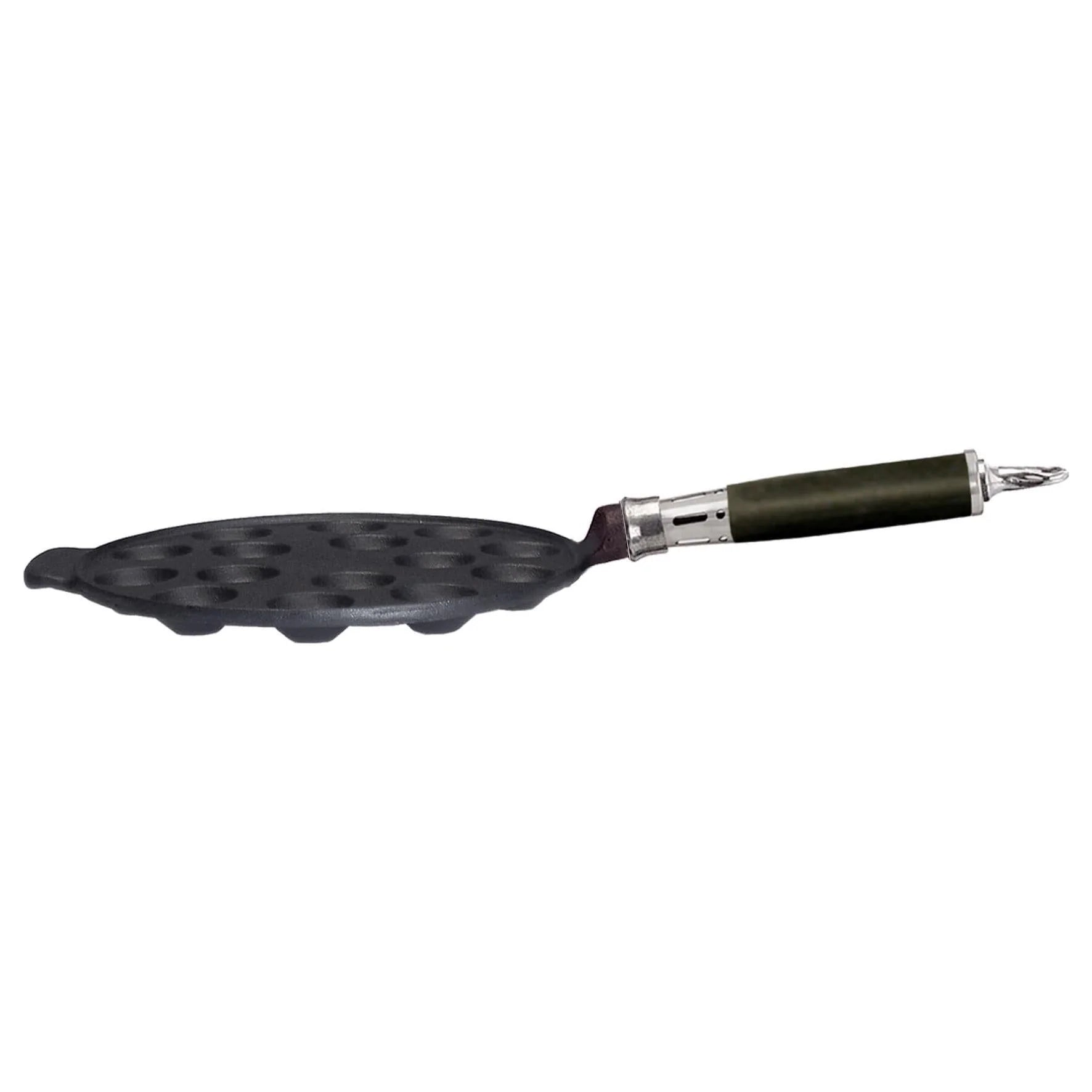 Gjutjärnspanna med 15 urtag för poffertjes (holländska småplättar). Komfortabelt silikonklätt rostfritt skaft som ger bra grepp och värmeskydd. Förinstekt med svensk KRAV-märkt rapsolja, redo att användas direkt.
